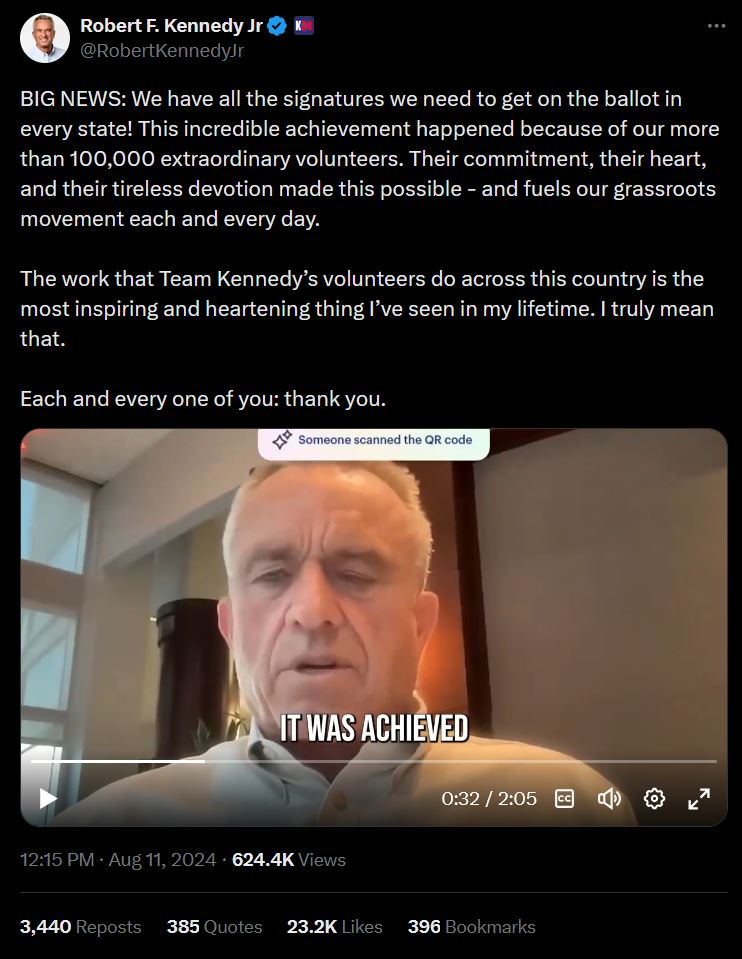 Kennedy may be about to announce that his campaign has met its goal of getting enough signatures to be on the ballot in all 50 states plus the District of Columbia. I had overlooked this X post from Kennedy until just recently: